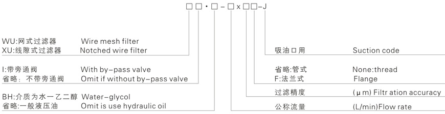 | 注:*為過濾精度,若使用介質為水一乙二醇。帶旁通閥。公稱流量100L/min,過濾精度80μm,帶則過濾器型號為:WUI·BH-100×*-J | ||||||